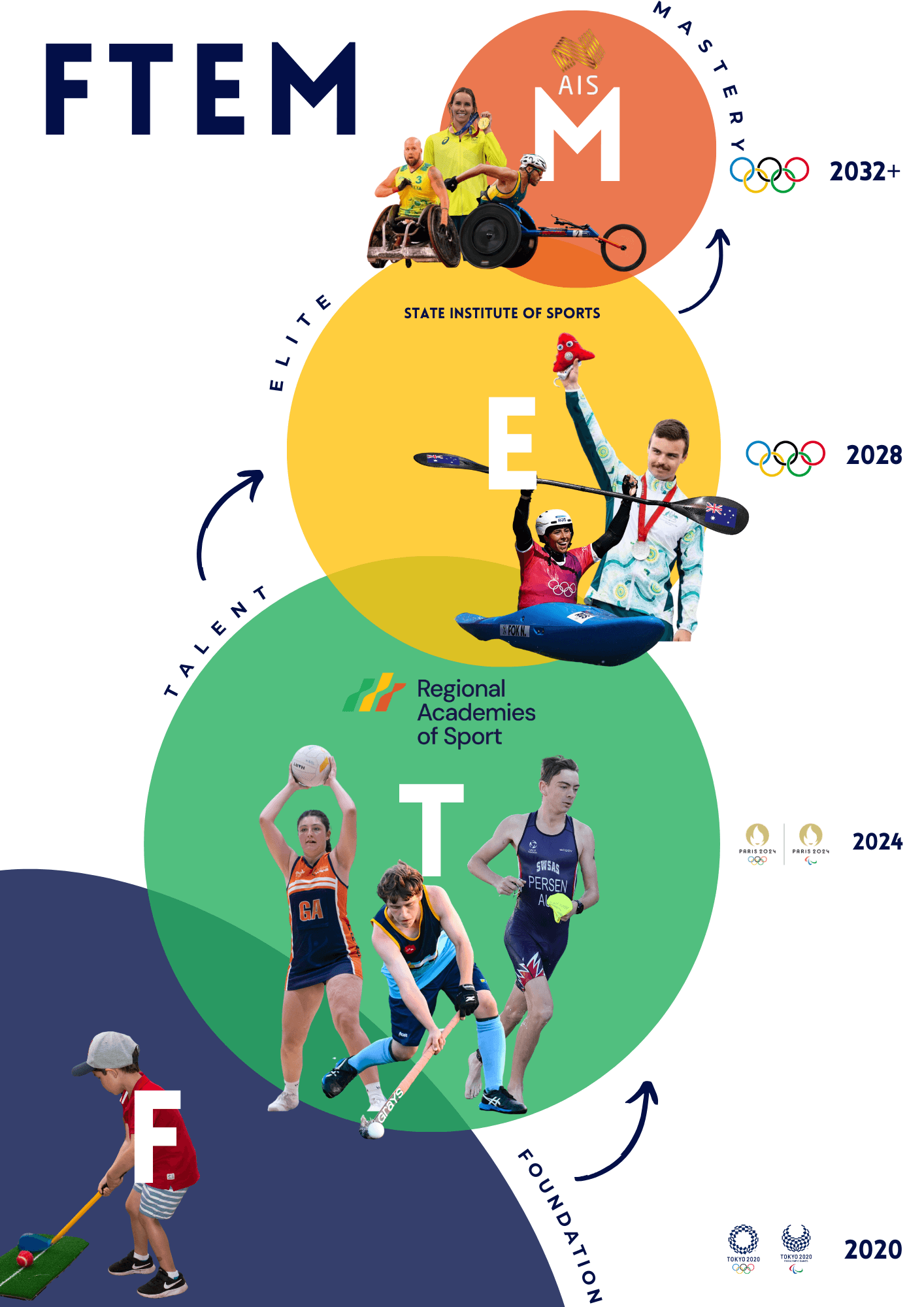 The Regional Academies of Sport are recognised in the FTEM model. We are commissioned by many sports, via their State Sporting Organisation, to operate in the T (Talent) section of the pathway moving athletes from T1 to T4.